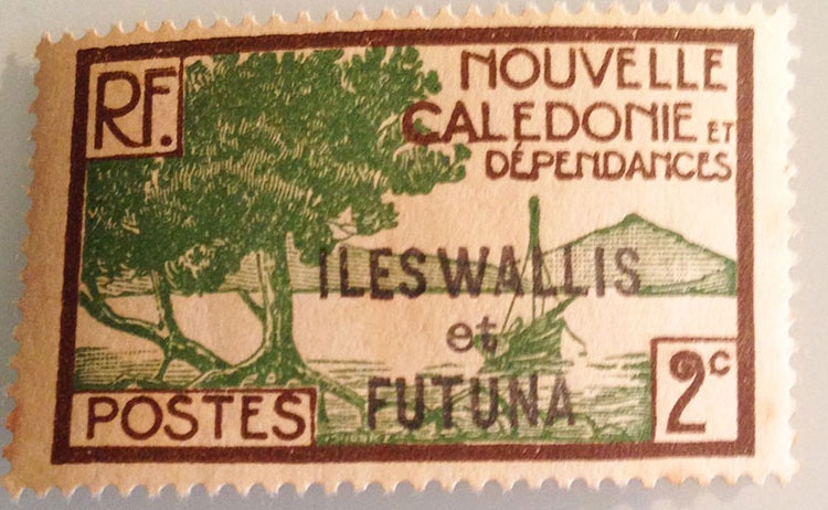 Nouvelle-Calédonie, timbre-poste de 1928 surimprimé iles Wallis et Futuna
